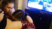 Пока парень играет в приставку, его тёлка с подружкой сочно насасывают ему хуй