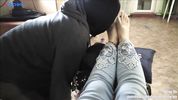 Квартирант отрабатывает долг за квартиру, вылизывая ножки хозяйки, пока та общается с мужем по телефону
