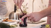 Парень домохозяит на кухне, и за это тёлка ему лижет очко